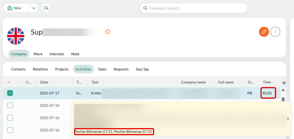 2. Go to company activities, find the archived e-mail > add 'Time' column and hover over the archived e-mail.