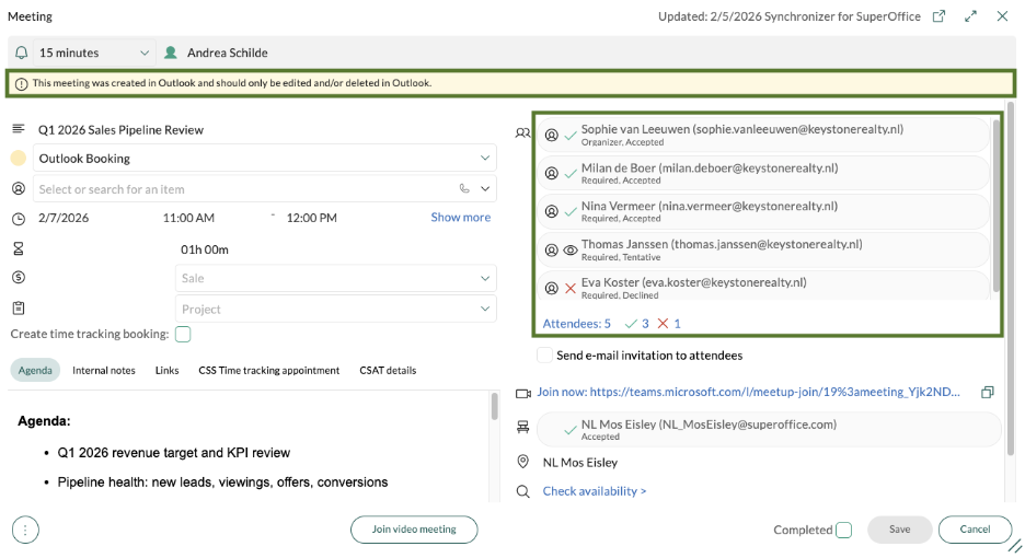 - In SuperOffice Diary, attendees are visible in the Attendees list + a warning shows when edits must be made in the system of origin.