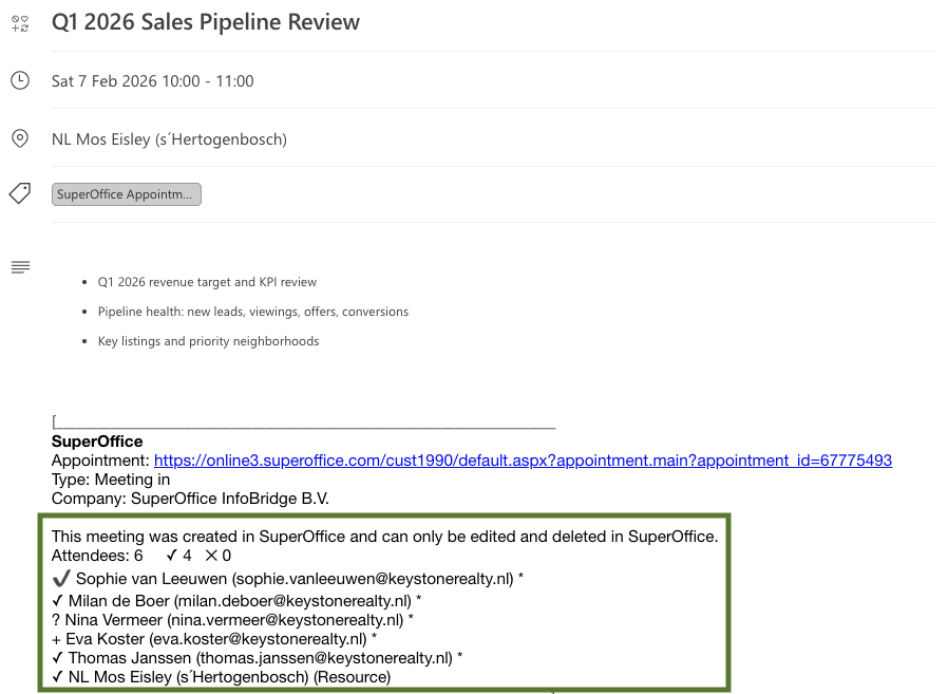 - In Outlook/Google, meetings created in SuperOffice show a SuperOffice info block in the appointment body/description with attendee details, a link back to the SuperOffice appointment, and a note that edits should be made in SuperOffice.