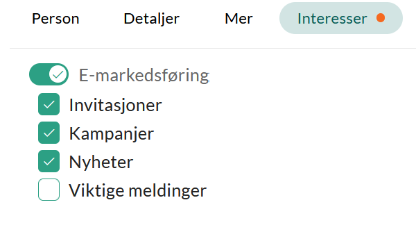 Do note that the table "ShipmentTypeReservation" will only contain a record for the interests under "E-Marketing" that are NOT checked, meaning it is like a block-list. No record automatically means allow. THOUGH, the the state in this table on person level is only relevant as long as the "E-marketing"-consent is also set to allowed. So this table can still contain a state for a person if the "E-marketing" consent is revoked. So blocks are made in at least two levels, first E-Marketing-consent-level, secondary on E-marketing-interest-level. I can see in the Person-table that there is two related fields, "nomailing" and "blockEmarketing". "nomailing" seems to mirror the enable/disable-value of the "E-Marketing"-header, "blockEmarketing" might be some kind of explicit block that may be set in some workflow.