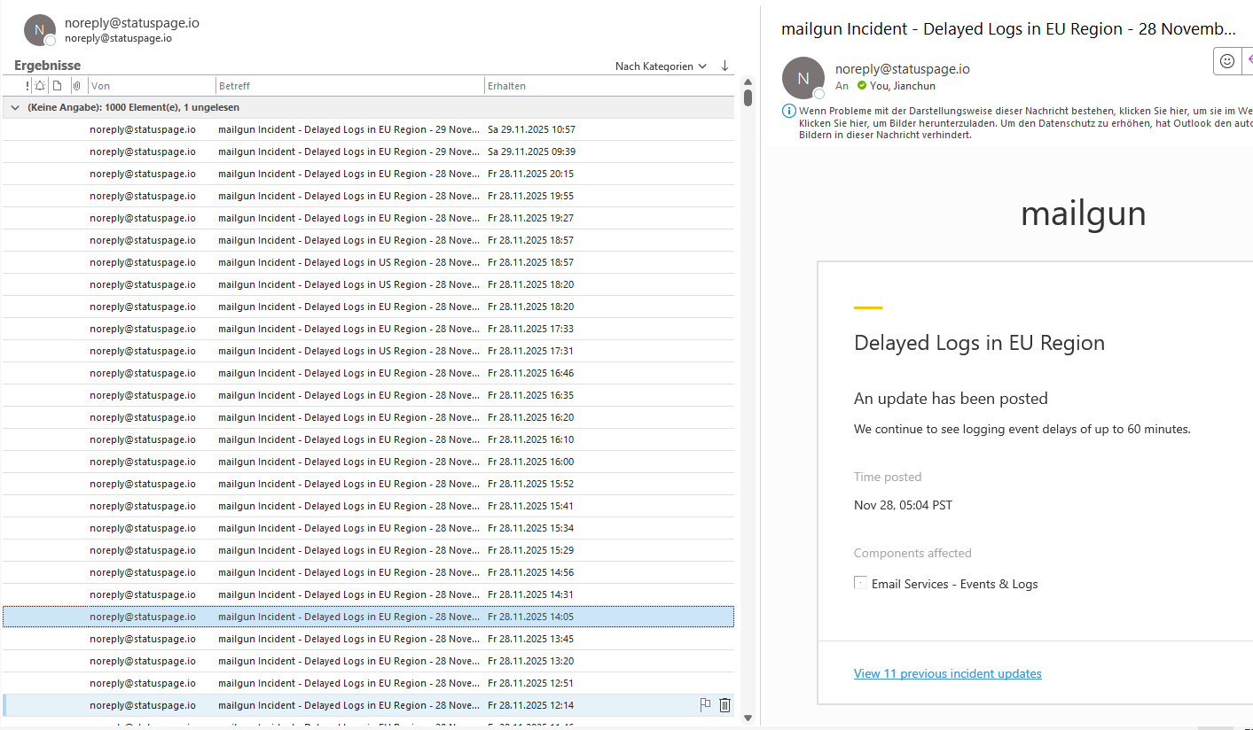 On 28th Nov. I got also 33 Email Notification from noreply@statuspage.io about Issues in Mailgun.
