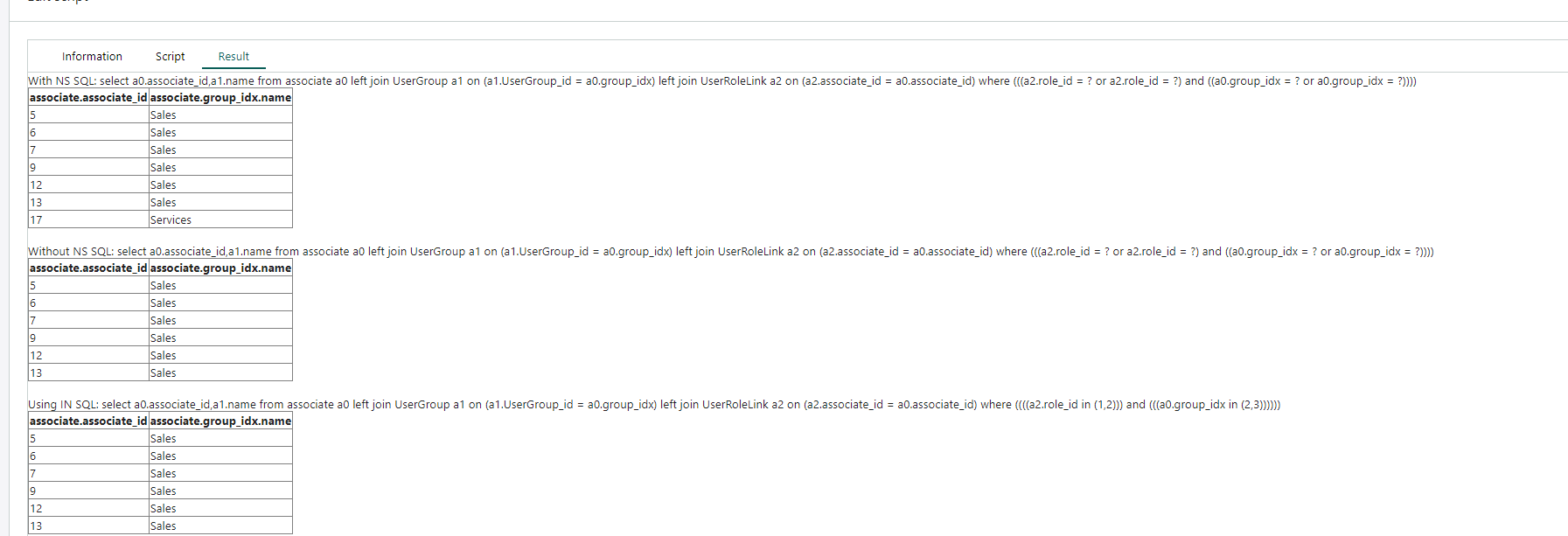 select a0.associate_id,a1.name from associate a0 left join UserGroup a1 on (a1.UserGroup_id = a0.group_idx) left join UserRoleLink a2 on (a2.associate_id = a0.associate_id) where (((a2.role_id = ? or a2.role_id = ?) and ((a0.group_idx = ? or a0.group_idx = ?))))