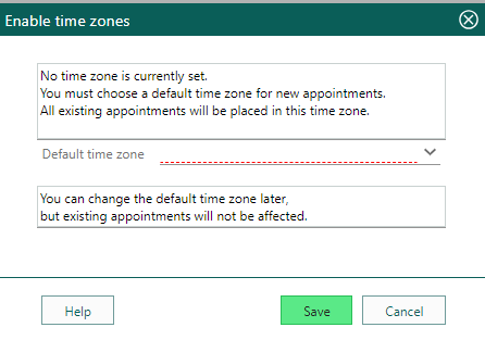 There is no Timezone configured on this tenant, and that might be the root issue, but it is also not possible to actually activate timezone as the dropdown is empty: