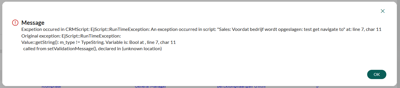 Put it into a before save (or after save) crmscript trigger, expect result would be a dialog box with the content, instead you get an error about trying to print a bool as string:
