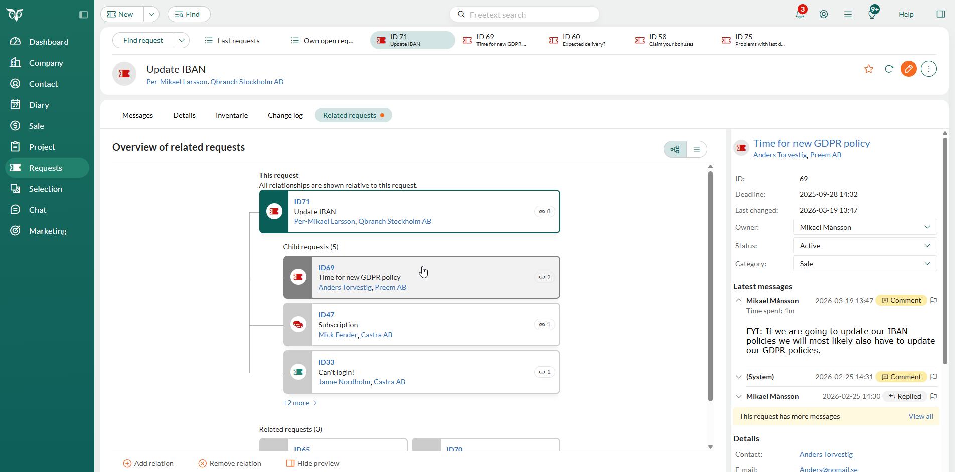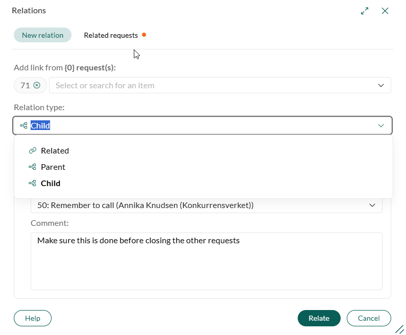 Request Relations lets you link any two or more requests using a defined relation type. Three standard relation types are built in from the start: