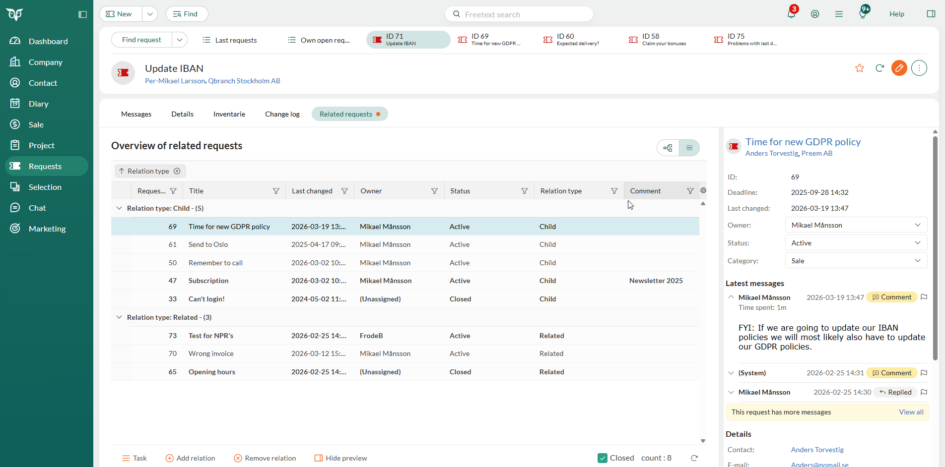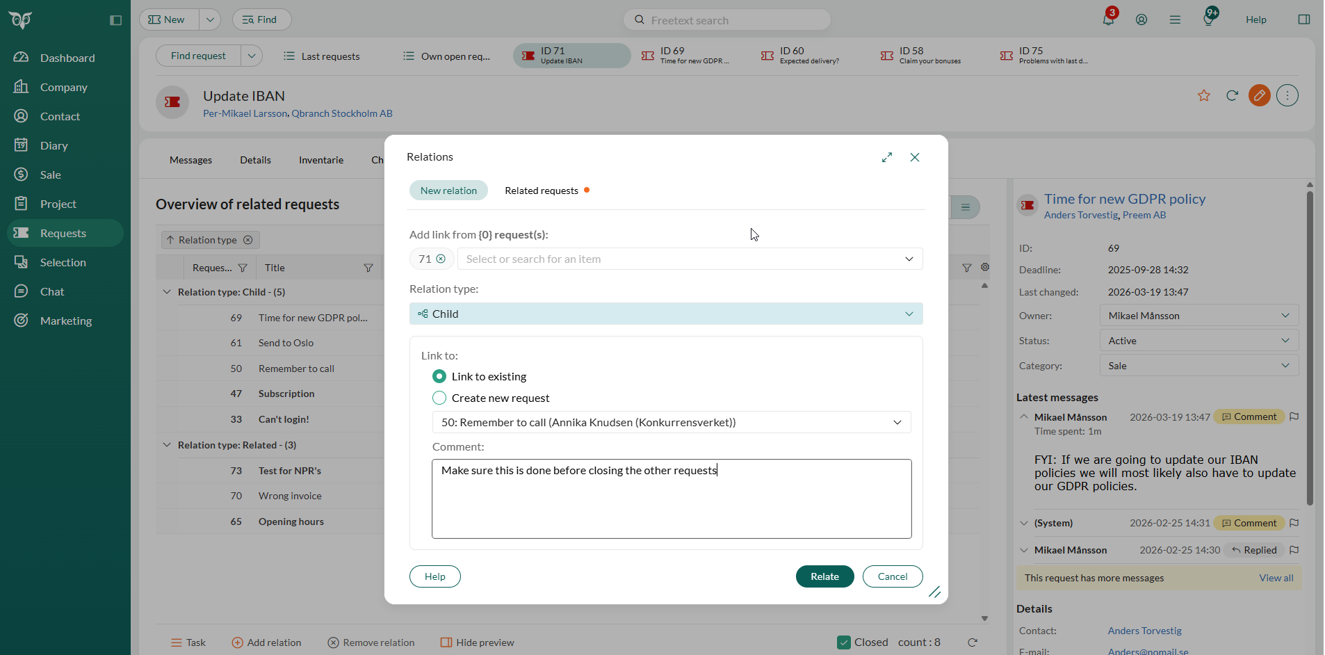 With Request Relations, SuperOffice Service now makes it easy to relate requests together, visualize how they relate, and manage them as a connected whole, without ever losing the thread.