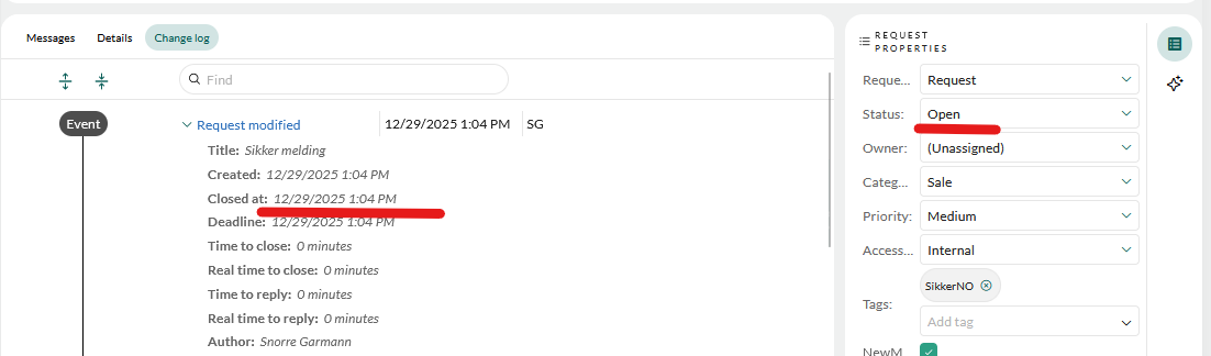 In the change log of the request it also looks like the request is closed, even if it is open.