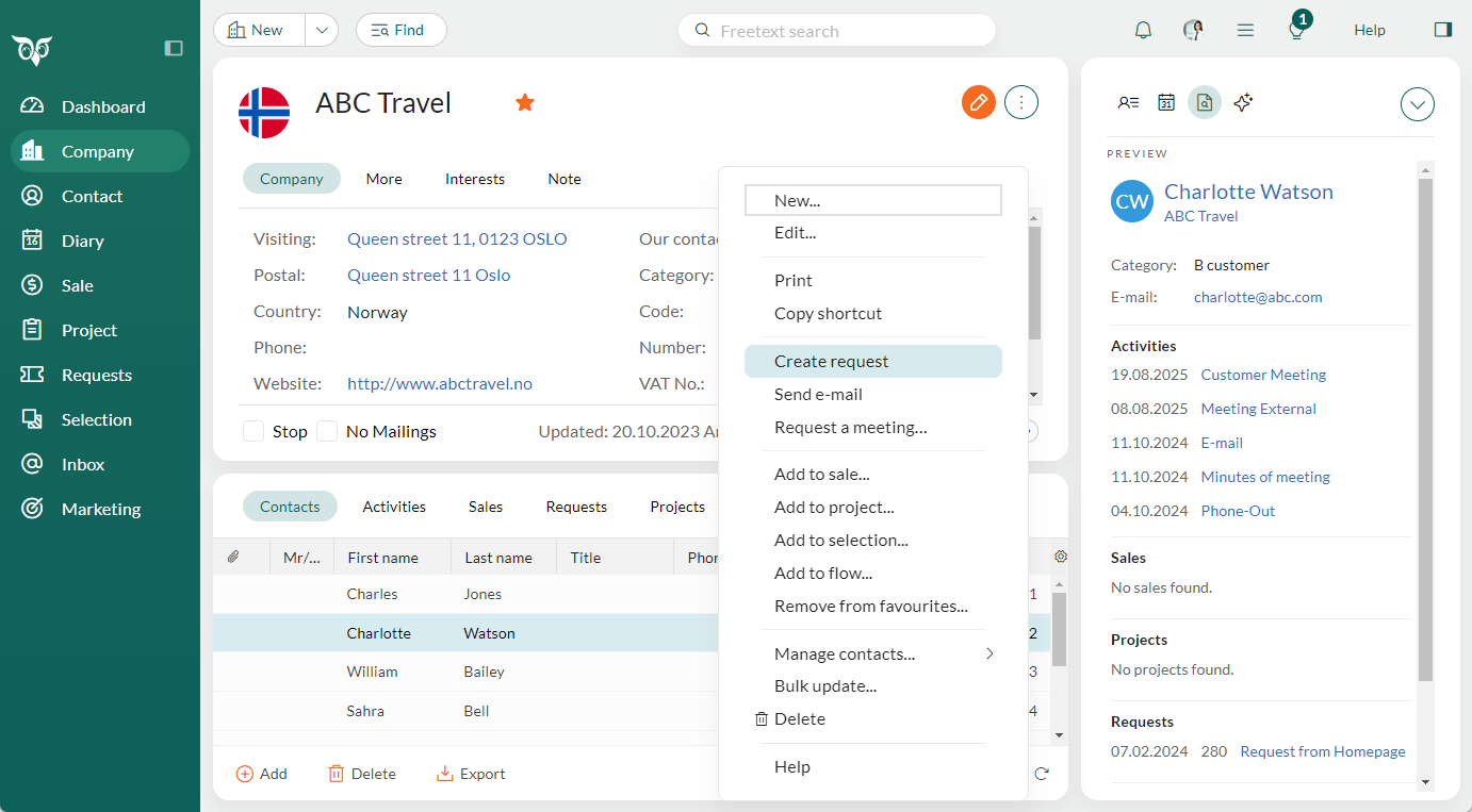 This shortcut is available anywhere contacts are listed; whether in sales stakeholders, project members, or the company/contact tabs in Selections.